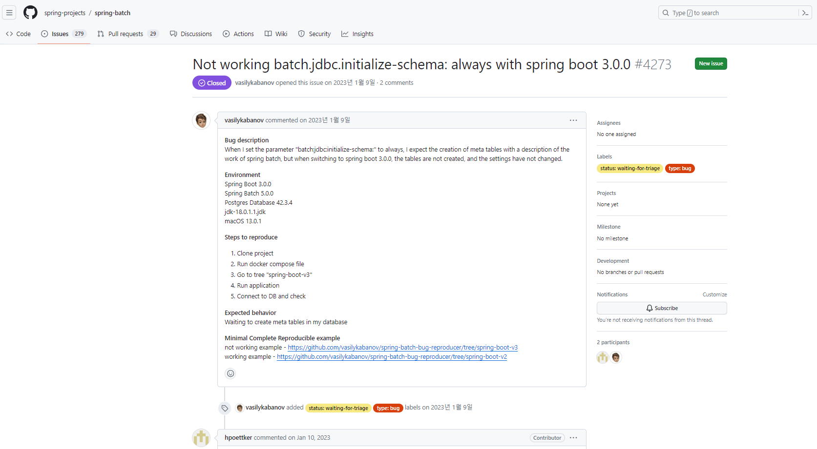 Spring Batch에 spring.batch.jdbc.initialize-schema = always를 부여하면 자동으로 배치 테이블이 생성이 되야 하나 Spring Boot 3.X 버전에서는 안되는 현상이 있음을 파악했다.